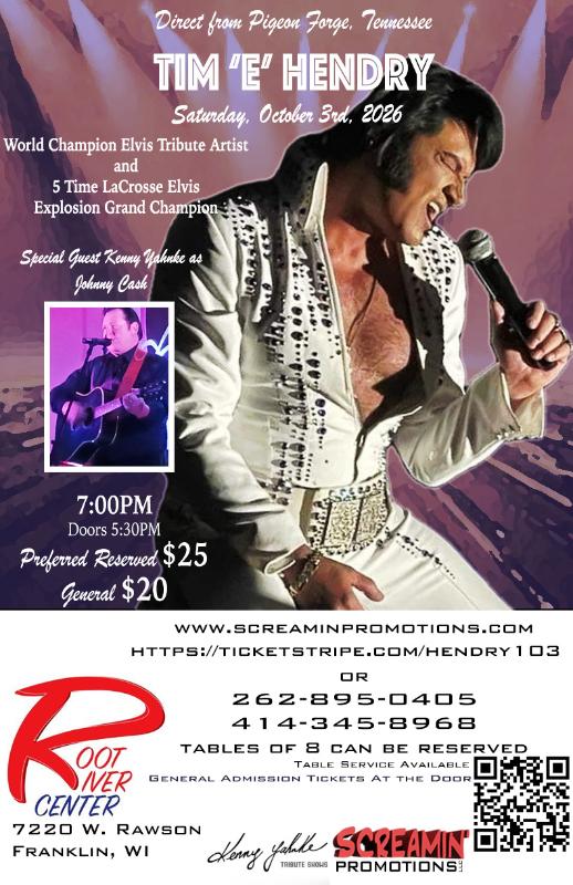 Screamin’ Promotions, in cooperation with Kenny Yahnke Tribute shows, is pleased to present, from Pigeon Forge, Tennessee, World Champion Elvis Tribute Artist, and five time Lacrosse Elvis Explosion Grand Champion, Tim ‘E’ Hendry, returning back to Wisconsin on Saturday, October 3rd, 2026, 7:00 p.m. at Root River Center in Franklin, WI.