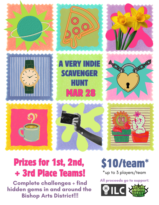 Get ready to explore, laugh, and compete your way through one of Dallas’s most colorful neighborhoods! A Very Indie Scavenger Hunt is a playful race through the streets of Bishop Arts District hosted by the team behind the Dallas Indie Comedy Fest.