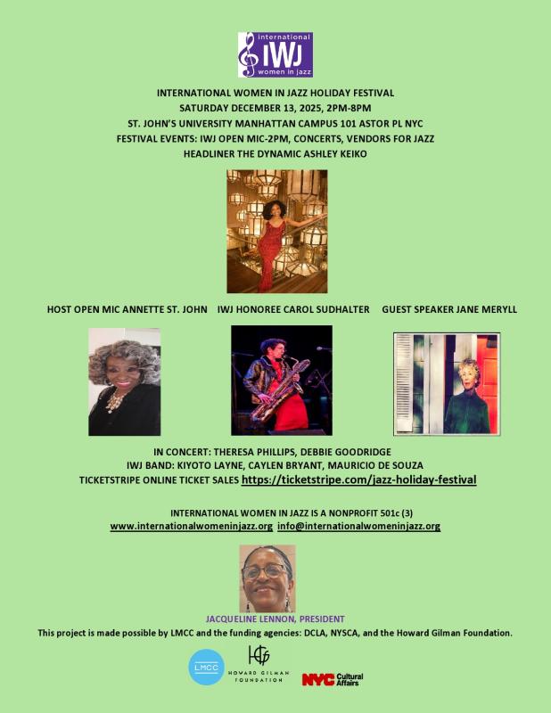 International Women in Jazz IWJ) will present its International Women in Jazz Festival fundraiser on Saturday, December 13, 2025. IWJ will recognize and pay tribute to the achievements and significance of women jazz musicians and share their talents with the community while promoting jazz awareness to people of all ages. Our event includes a fantastic lineup, Open Mic, seminars, Vendors for Jazz, and concerts. Your support will continue IWJ's efforts to emphasize Jazz, as an American art form, and to honor, recognize and support women artists who are upcoming, seasoned and legendary and of all ages. We look forward to seeing you and appreciate your continued support.
