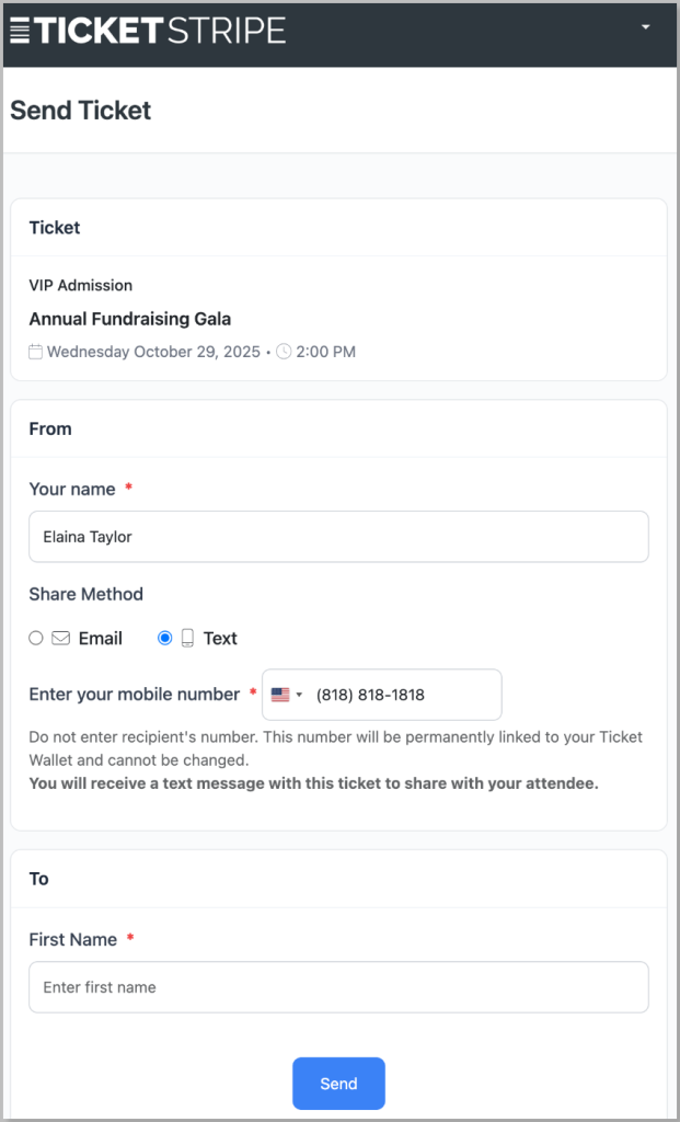 When claiming their ticket, the recipient will be asked if they want to receive text messages regarding their ticket(s). Opting in will enable TicketStripe to send ticket-related SMS messages to attendees directly in the future.