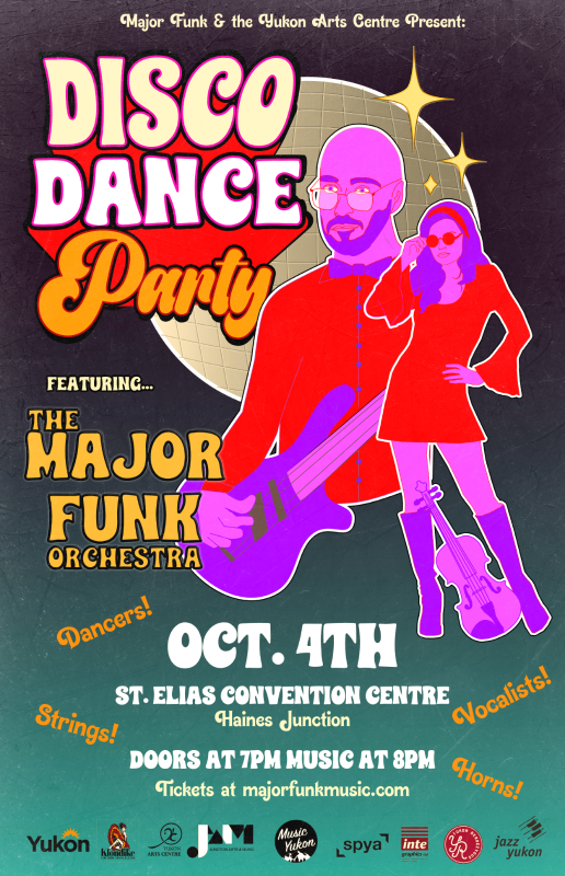 The Yukon’s long running dance party experts, Major Funk, have assembled an all-star team of musicians and dancers to bring you an unforgettable night of DISCO dance music. The 13-piece “Major Funk Orchestra” features the Yukon’s favourite neighbourhood funk band, Major Funk, plus a full string section, additional horns, guest vocalists, and percussion. With a full night of curated disco tunes, choreographed dance performances, costumes and decorations straight from the disco era, the disco vibes and dance floor good times will be grooving all night long!