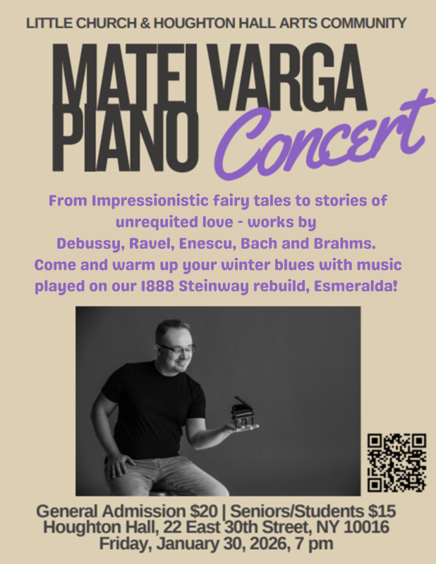 We invite you to join us for a special concert featuring Matei Varga on piano. From Impressionistic fairy tales to stories of unrequited love - come enjoy works by Debussy, Ravel, Enescu, Bach, and Brahms. Warm up your winter blues with music played on Houghton Hall's new piano Esmeralda!