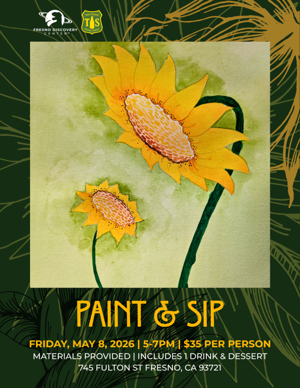 Join us for another Paint & Sip, a relaxed and creative evening at Tioga Sequoia Beer Garden. Enjoy a guided painting session with a Fresno Discovery Center's paint instructor, great company, and a fun night out. All painting materials are provided and each guest will receive one drink and dessert with their ticket.