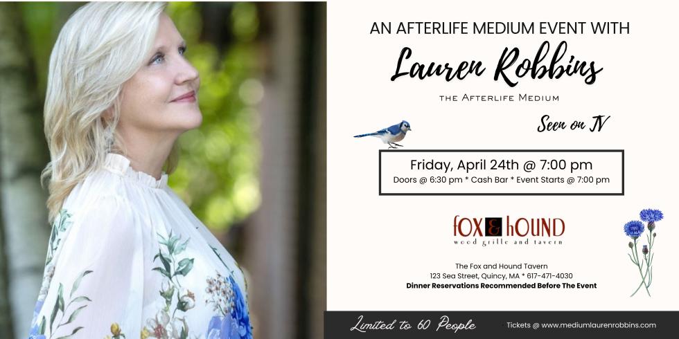 Limited to 40-60 people, tickets are priced based on the number of attendees and are non-refundable or transferable to another date. If you are unable to attend, a friend or family member may check in under your name. It is not recommended that anyone under 18 attend. Dinner reservations made in advance at the restaurant are highly recommended to ensure you can park and eat in the dining room before the event begins. This location is handicap accessible. Doors open at 6:30 pm for check-in. The event begins at 7:00 pm. Contact Lauren's office at 781-373-8017 with ticket questions at least 24 hours before the event. Visit www.mediumlaurenrobbins.com for more information about Lauren, her sessions, and transformative events.