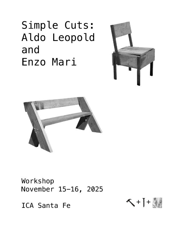 Simple Cuts examines the furniture designs of Aldo Leopold, the American ecologist and philosopher whose work helped establish the Pecos as the first designated wilderness in the United States, and Enzo Mari, the Italian designer and theorist celebrated for his uncompromising vision of design as a social and political act. Both embraced simplicity not just as an aesthetic choice, but as an ideological position. Alongside their work, the project brings in local voices from lumber, forestry, conservation, and design to open a critical conversation about the total path a piece of furniture takes — how something as humble as a wooden chair connects to complex politics of land, labor, and use.