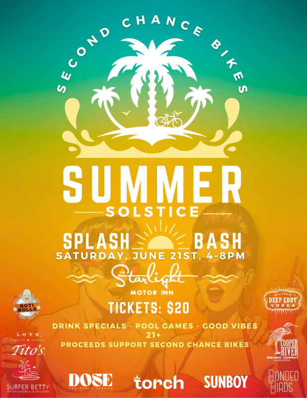 Our upcoming Summer Solstice Splash Bash will take place Saturday, June 21st from 4pm to 8pm at the Starlight Motor Inn pool and pool house. Trust us, you won't want to miss this party! We'll have some wet and wild pool games, DJ Cowboy Montana spinings tunes, tasty treats for sale from local food truck Roti Rolls, and refreshing adult beverages featuring Tito's Handmade Vodka, Deep Eddy Vodka, Sunboy, and Cooper River Brewing. We'll also have Torch THC drinks whipped up into sorbet, Dose the Party Stream, a photobooth from Goodonya Photo, permanent jewerly from Bonded Birds, hair care goods from Surfer Betty, and other cool stuff. Folks that ride bikes to the event will be entered into a special secret raffle! This fundraiser is 21+.