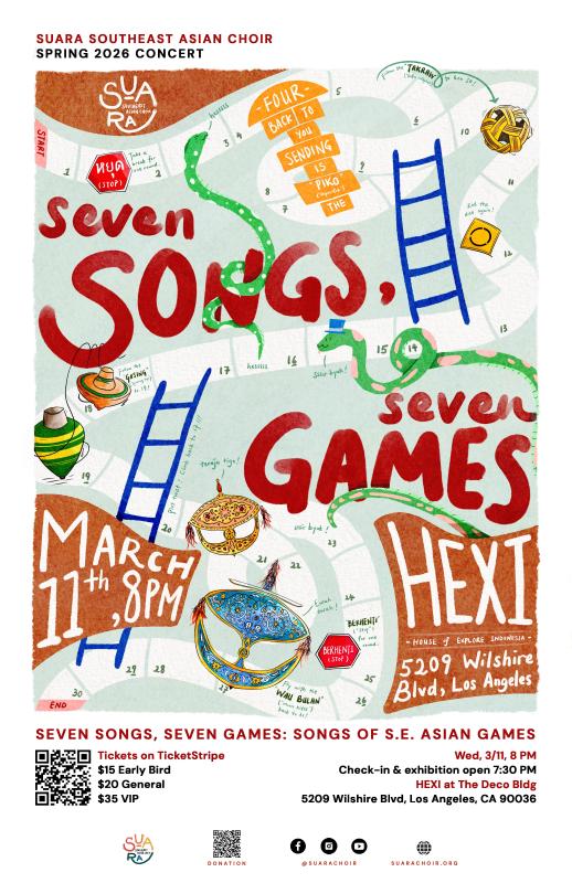 Play lives at the heart of SE Asia—echoing across village fields, schoolyards, alleyways, and living rooms. It pulses through tug-of-war ropes stretched across dusty grounds, bursts out in fast-paced counting games, and vibrates in the rhythmic syllables of musical play. In this concert, Suara transforms the House of Explore Indonesia - LA (HEXI) into a playground, where audiences don’t just listen, but become part of the game—clapping, responding, and moving.