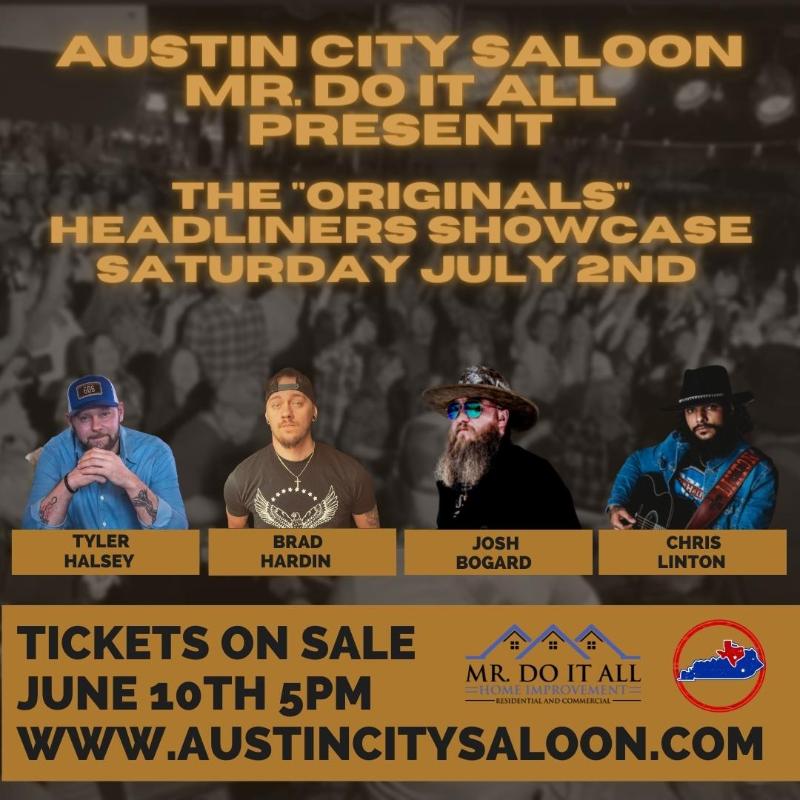 Austin City Saloon and Mr. Do It All presents The "Originals" Headliners Showcase with Tyler Halsey, Brad Hardin, Josh Bogard and Chris Linton on July 2, 2022.