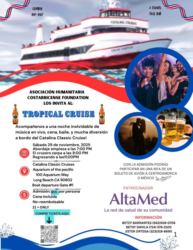 La Asociación Humanitaria Costarricense Foundation es una organización sin fines de lucro enfocada a la ayuda humanitaria, involucrando principalmente a niños y adultos mayores y con discapacidades. Proporcionamos a los necesitados artículos como muletas. andaderas, sillas de ruedas, camas de hospital, así como en determinadas ocasiones, ayuda económica/monetaria. Cada año realizamos varios eventos benéficos con el fin de recaudar fondos para estas ocasiones. Uno de los eventos que organizamos es un " TROPICAL CRUISE". Este evento consiste en alquilar un barco privado, donde aproximadamente 350 personas se unirán a nosotros para bailar saborear de una rica cena, beber y y disfrutar con sus amigos. El tema que escogimos para el vestuario de verano. El evento dura aproximadamente 4 horas y se llevará a cabo en Long Beach, CA el 29 de Noviembre , 2025 (de 7:00PM a 11:00PM).