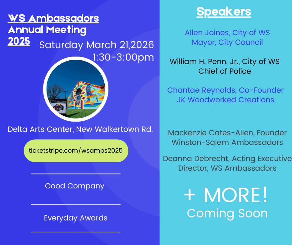 Join us at the WS Ambassadors Annual Meeting for speakers, food, fun and good Winston-Salem spirit! We will be celebrating our 2025 year and the Everyday Awards winners.